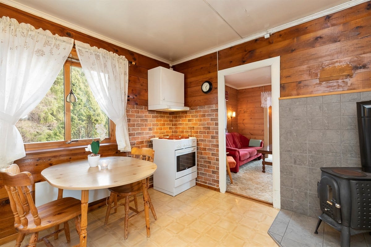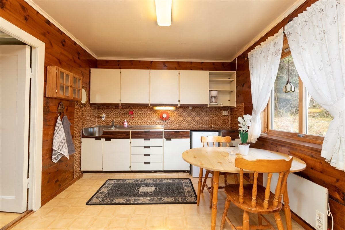 Kjøkkenet har innredning med over- og underskap, laminat benkeplate og nedfelt vaskekummer i stål. Innredningen har frittstående hvitevarer som kjøleskap/frys og komfyr. Hvitevarene følger med salget.