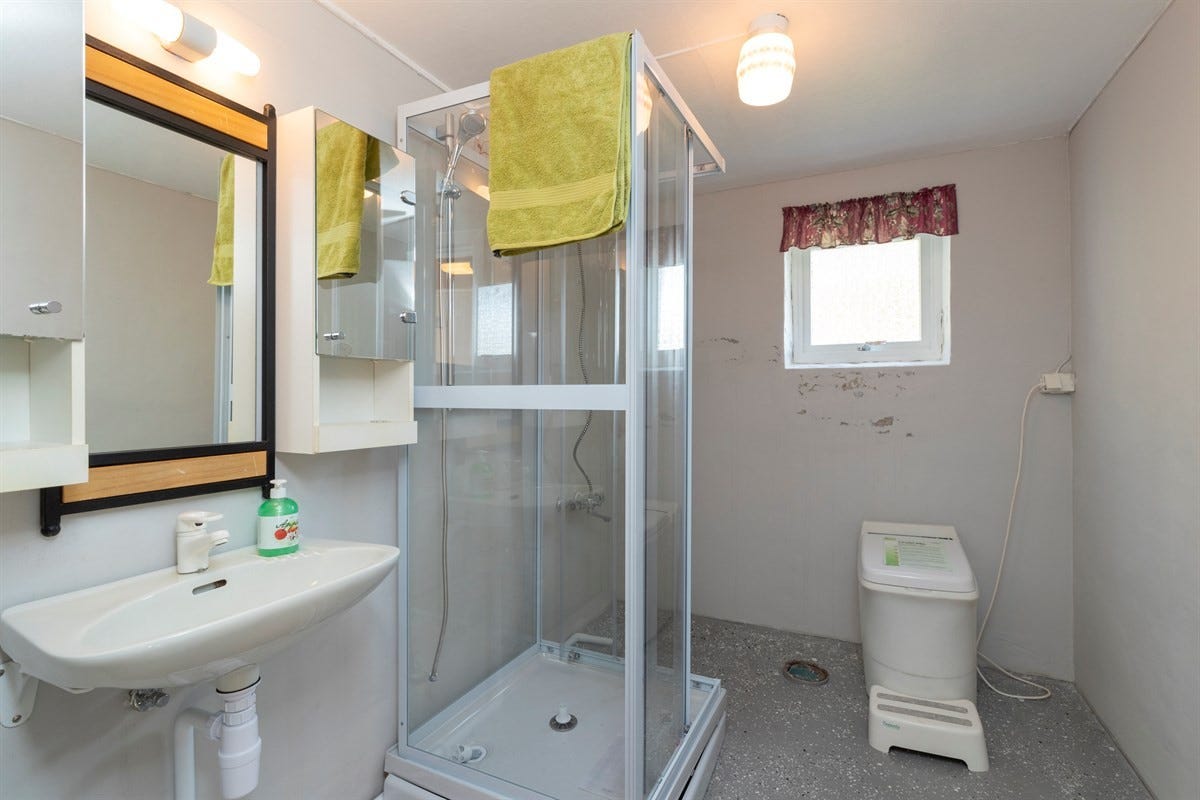 Badet er plassert i underetasjen og har gulv av betong med epoxy, veggene er pussa og lysmalte. Innhold: Dusjkabinett, elektrisk forbrenningstoalett, vegghengt servant, speil med belysning. Vaskerommet ligger vegg i vegg med badet og har gulv og vegger i betong. Innhold: Opplegg for vaskemaskin, varmtvannstank og hovedstoppekran.