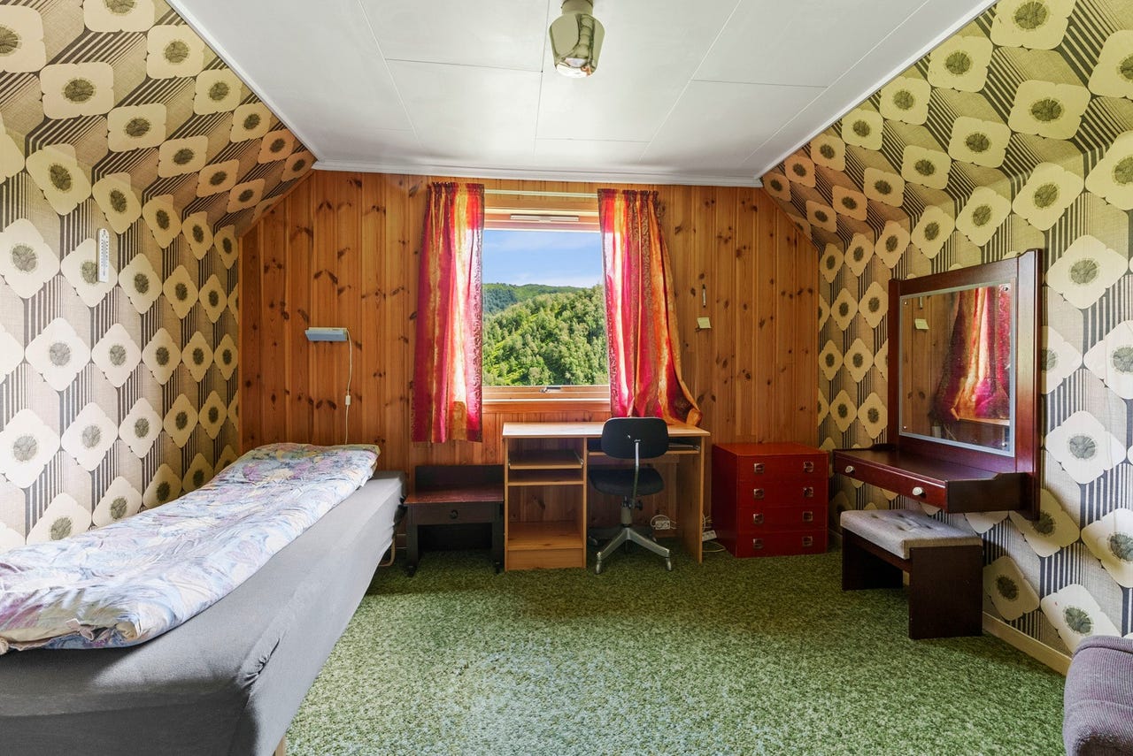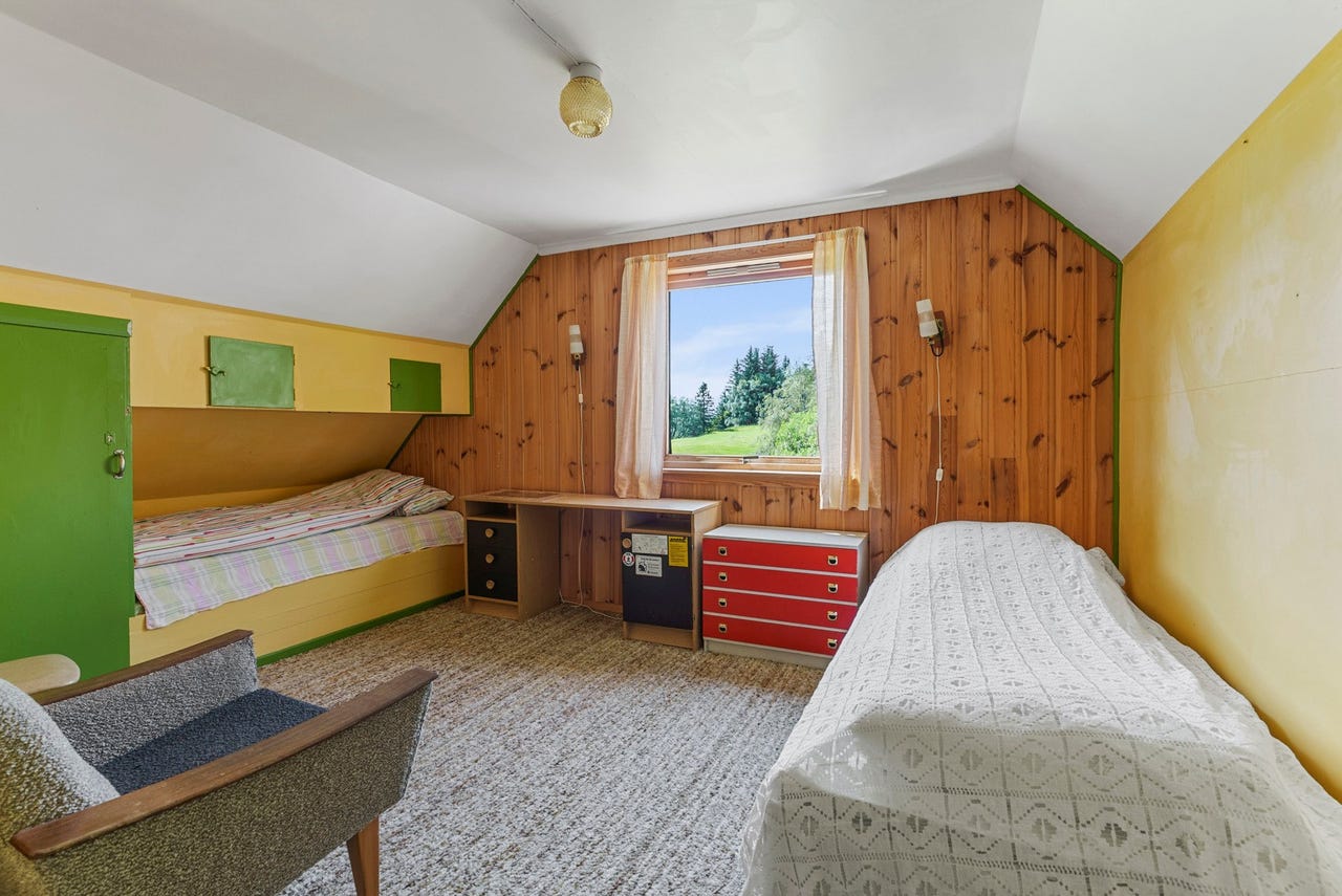 Innhold: Gang m/trapp, 3 soverom, knekott mot skråtak.