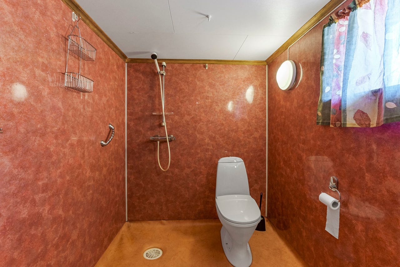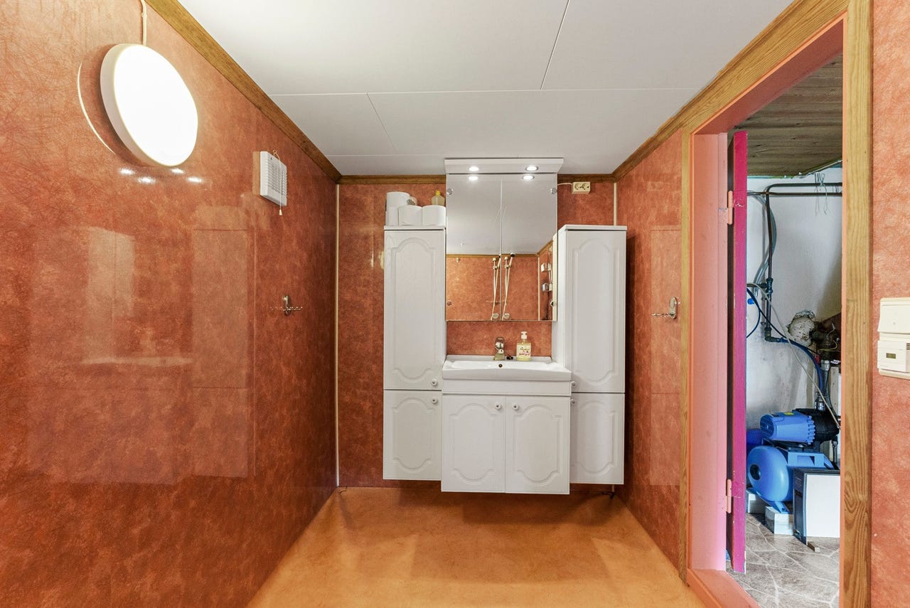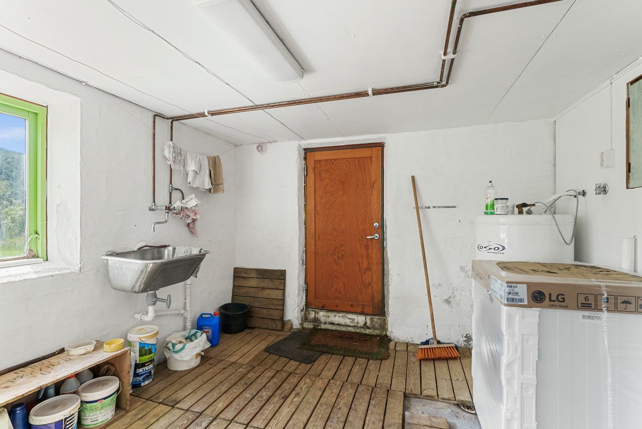 Badet er plassert i kjelleretasjen og er innredet med dusjhjørne, klosett og baderomsinnredning med servant. Badet har belegg på gulv og baderomsplater på veggene. Vaskerommet har enkel standard med gulv og vegg-overflater med malt murpuss og betong.