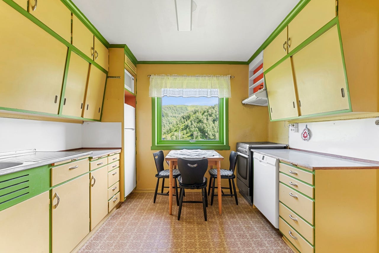 Kjøkkenet har plassbygd innredning fra byggeår med malte overflater, stålbeslag og benkeplate i laminat.