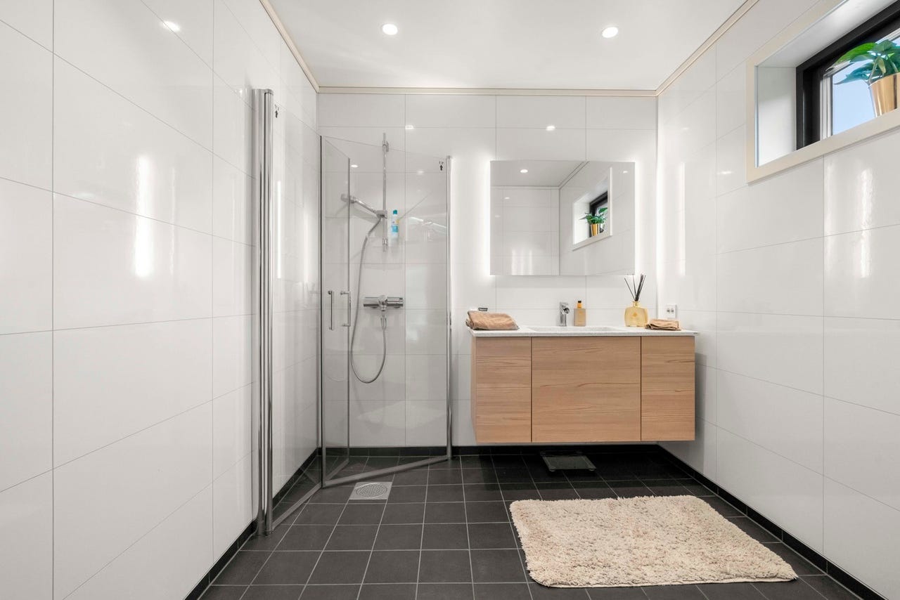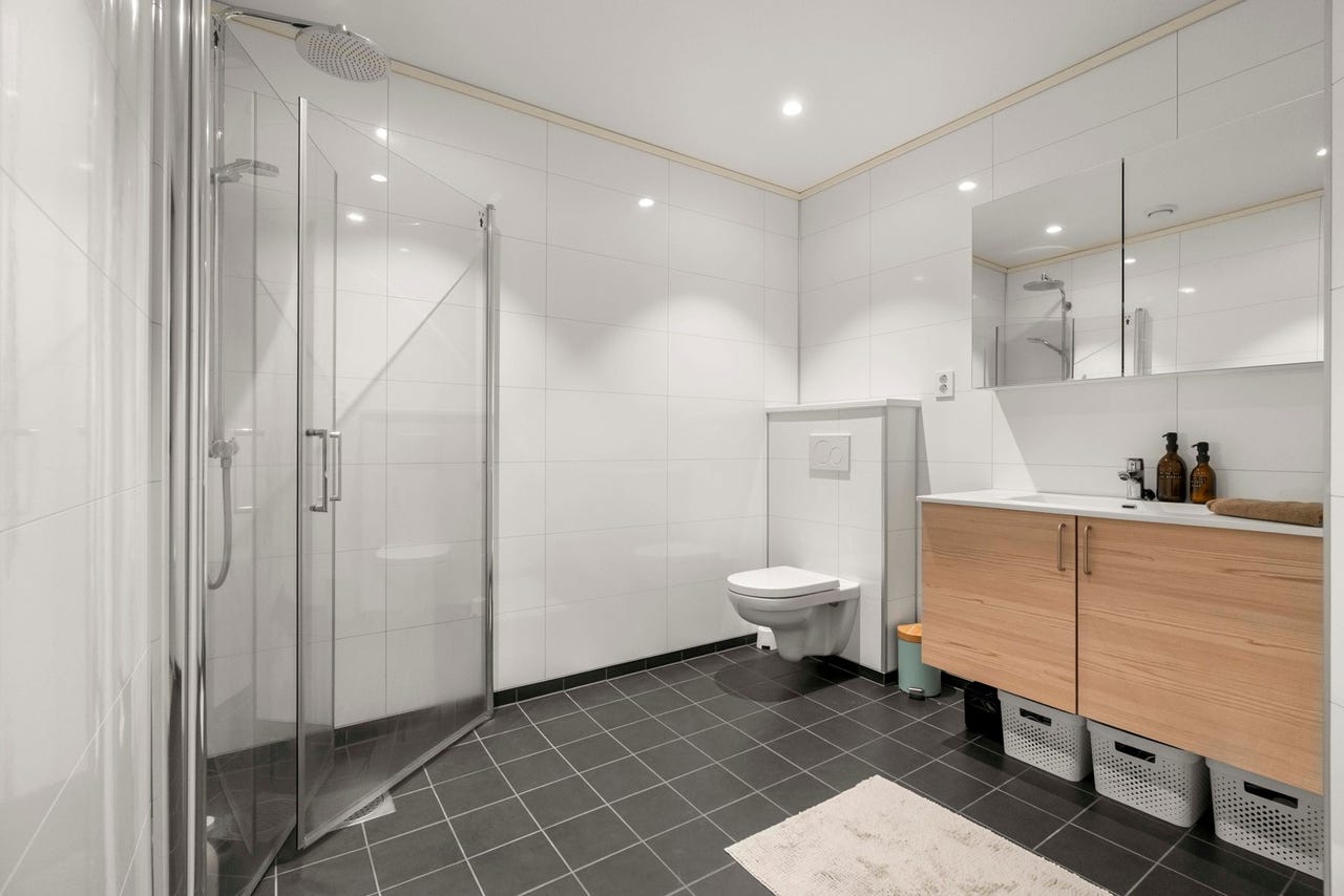 Fliser på gulv med elektriske varmekabler. Baderomsplater på veggene og malte plater i taket. Rommet er innredet med servant i underskap, speil med integrert lys, dusjhjørne og vegghengt toalett. Det er balansert ventilasjon i rommet.