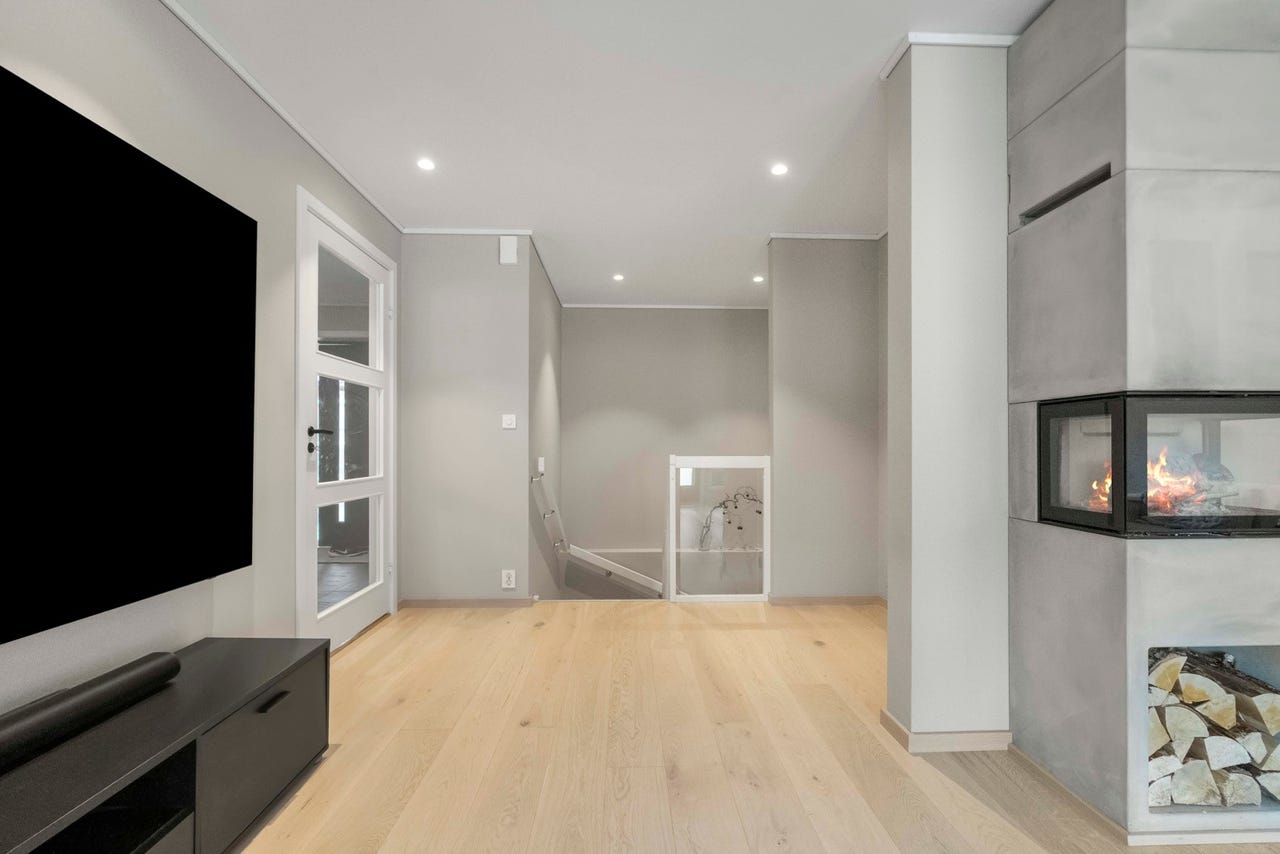 Varmekabler i gulv på alle rom i kjelleren, i tillegg til entrè og bad i 1.etasje.