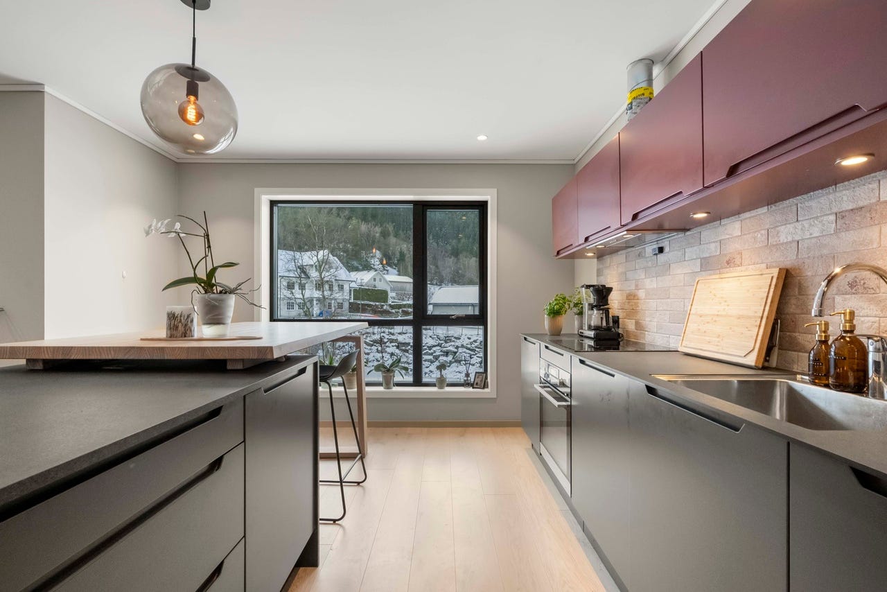 Kjøkkeninnredning fra HTH med malte fronter av finèr, laminert benkeplate og stål oppvaskkum. Det i tillegg en benk med benkeplate i heltre. I innredningen er det integrert stekeovn, induksjon koketopp, oppvaskmaskin og kjøl/fryseskap. Fliser på vegg ved benkeplaten. Belysning i underkant av overskapene. Kjøkkenet er utstyrt med ventilator med avtrekk til det fri.