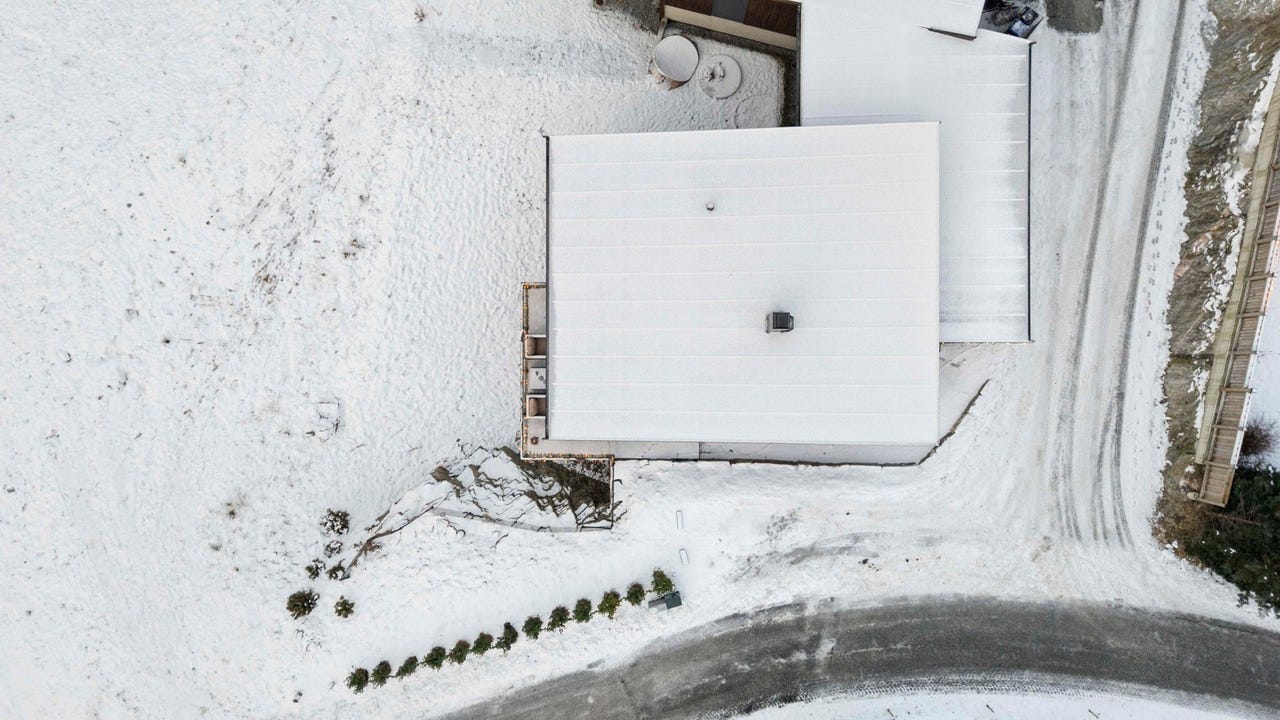 Boligen har taktekking av pvc-duk. Takrenner og taknedløp i stål. Heldekkende pipebeslag. Takkonstruksjonen er oppført som pulttak. Flatt tak over sportsbod ved inngangsparti/carport. Arealet på overbygg og carport ved inngangspartiet er på ca 36 m2. Mindre overbygg over inngangsparti i kjeller.