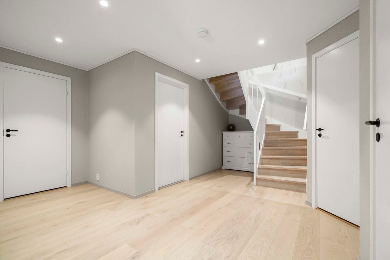 Det er parkett på gulvene, og malte gipsplater på veggene og i innvendige tak.