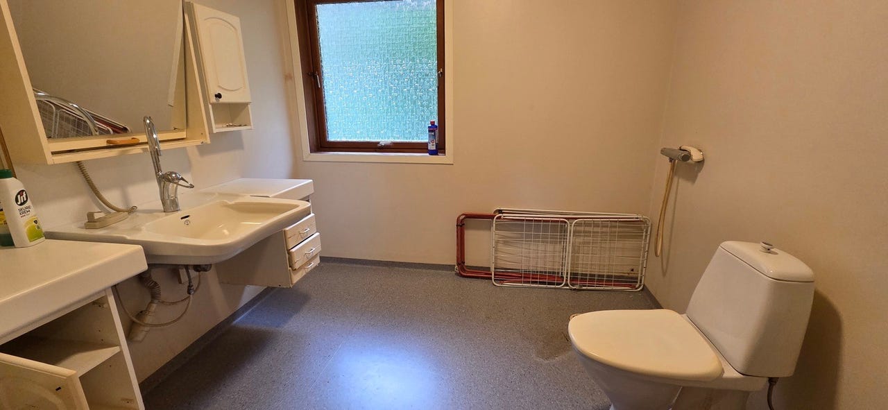 Badet har belegg på gulv med elektriske varmekabler, på veggene er det malt strie og malte takplater i taket. Rommet er ellers innredet med servant, speil med lysarmatur, høgskap, overskap, dusj/blandebatteri og toalett. Plastsluk. Naturleg ventilering i vindu. Baderomsinnredningen er tilpasset rullestolbruker.