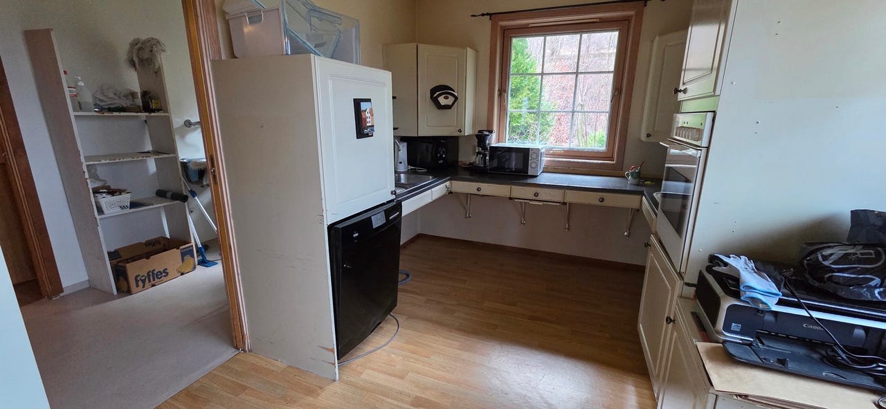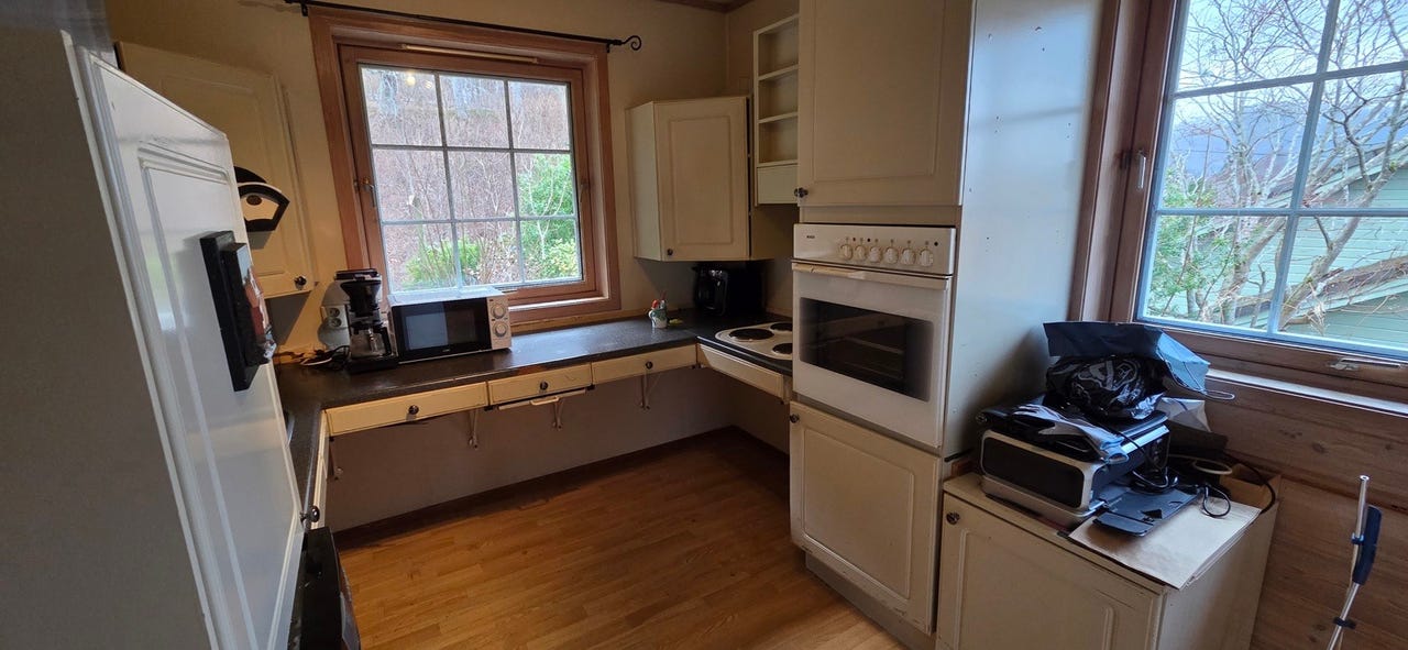 Kjøkkenet har innredning med malte fronter av finèr, laminert benkeplate, stål oppvaskkum og opplegg for vaskemaskin. I innredningen er det integrert koketopp og steikeovn. Det er kjøkkenvenilator med avtrekk ut.